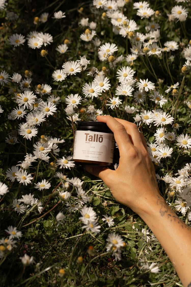 At Tallo Skin, we prioritise quality and sustainability. We support our regenerative Aussie Farmers along the South Coast in NSW. We know them by name and how much love they pour into their land and cattle...ensuring the highest standards of animal welfare and environmental care. We render the suet at a low temperature to preserve the integrity of the fatty acids and nutrients. Thanks to its naturally long shelf life, our tallow requires no added preservatives or chemicals, maintaining its pure and natural state. After undergoing a gentle purifying process with flitered water, our tallow is then blended with 100% organic jojoba oil, along with any botanicals used in our scented range.